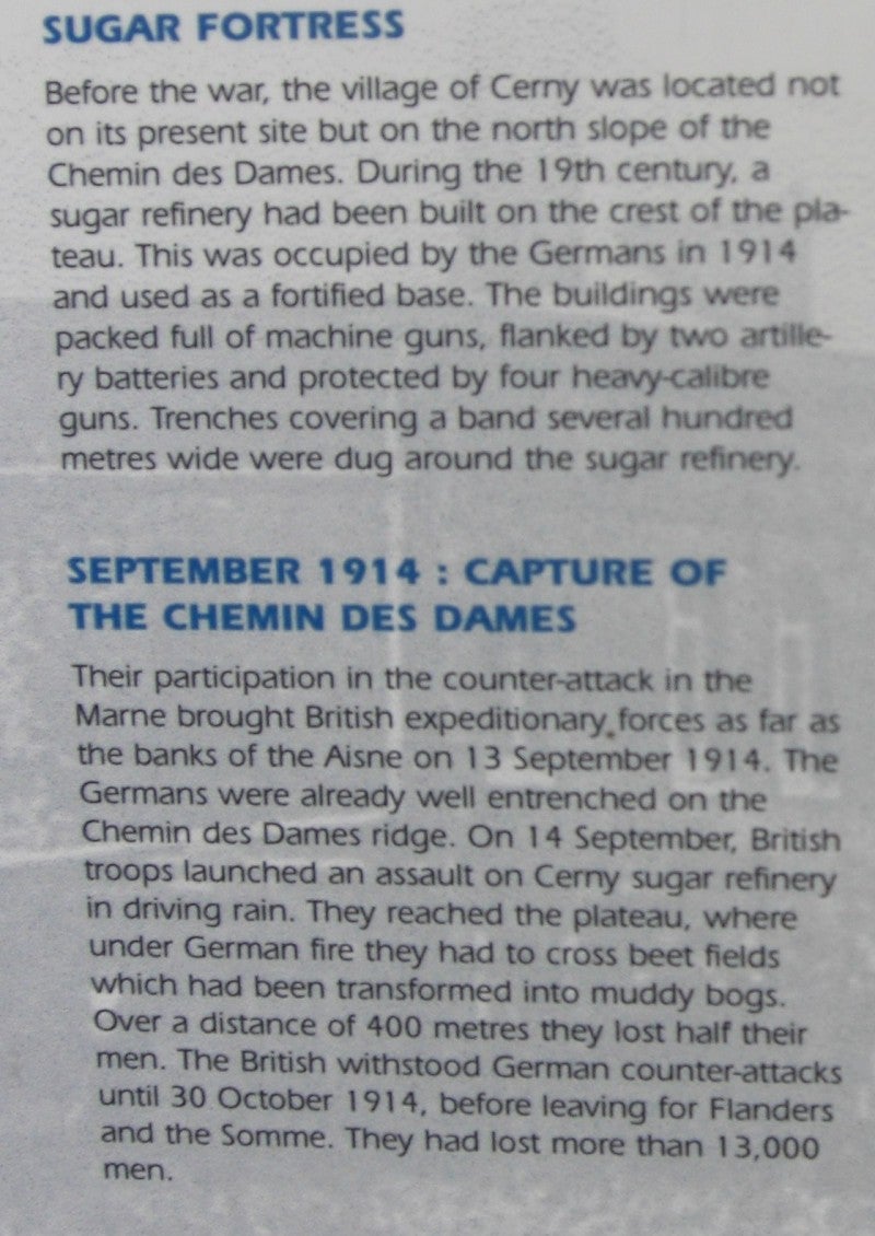 Bij het kruispunt bevond zich ook de suikerfabriek/raffinaderij, vanaf 1914 door door de Duitsers gebruikt als een bolwerk waarmee de zuidelijke flank van de Chemin des dames kon worden beheerst. Al in 1914 werd om dit gebouw op deze locatie hevig gevochten door de Engelsen en Duitsers. Deze suikerfabriek bestaat niet meer. zie ook hiernaast.