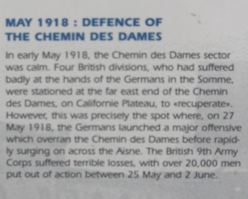 Vanaf Bourg et Comin dat aan de Aisne ligt, de rivier waarachter de duitsers zich uiteindelijk terugtrokken na de slag aan de Marne, rijd je de langgerekte heuvel op waarover de Chemin des Dames loopt. Bij het kruispunt ligt onderstaand monument met even verder op het gecombineerde Frans Duitse oorlogskerkhof. Nog even verder het na 1918 opnieuw gebouwde dorp Cerni en Laonnois.