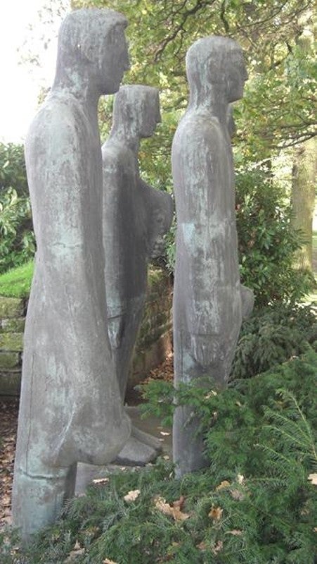Ingang van de begraafplaats met op de achtergrond de beeldengroep van Emil Krieger. Hij werd geinspireerd door een foto met treurende soldaten bij een graf van een kameraad.