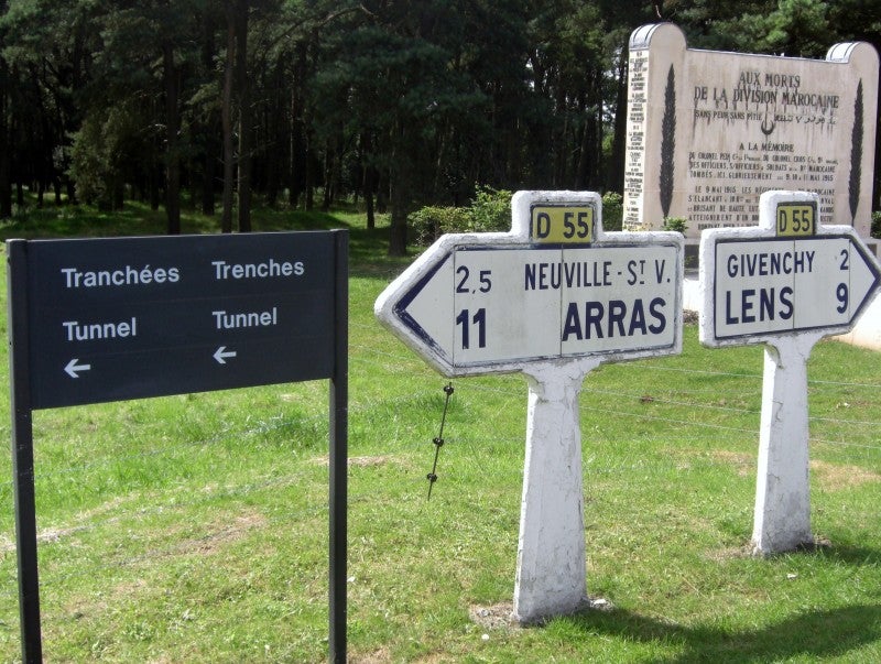 Tijdens de zogenaamde wedloop naar de zee (september/oktober 1914) hadden de Duitsers zich genesteld op deze hoogten bij de plaats Vimy. De Duitsers hadden er al in 1914 een doolhof van loopgraven en onderaardse schuilplaatsen van gemaakt. Indien veroverd zouden de Fransen een prachtig overzicht hebben over de vlakte van Douai waar de tegenstander zich moeilijk zou kunnen verdedigen. In 1915 werd dit gebied bij Vimy verdedigd door Beierse troepen onder kroonprins Ruppprecht van Beieren. In mei 1915 werd de eerste stormloop op deze hoogte door de Fransen ondernomen. Met zware verliezen werden de toppen bereikt en men had de vlakte van Douai voor zich. Echter door de Beierse korpsreserves werden ze weer verdreven.